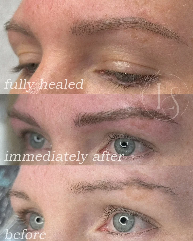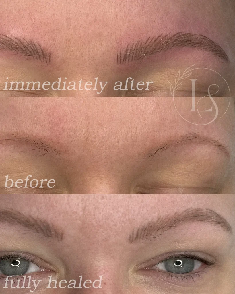 Powder brows are achieved using a machine shading technique that implants pigment into the skin in tiny, soft pixels. This creates a misted, airbrushed effect rather than individual hair strokes. The goal is to gradually build a soft front with more depth toward the tail of the brow. The healed results fade back to a more subtle result that blends beautifully with your natural brow hair.